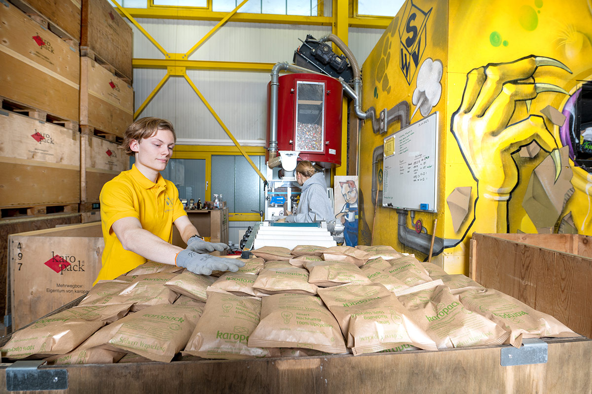 In der Südwest-Verpackungs-Halle werden alte Kartonagen und Altpapier in großen Mengen von der neuen Schredder-Maschine geschluckt und neue Polsterkissen produziert. Diese werden als Verpackungsfüllstoff den zu versendenden Waren beigefügt, so dass sie heil beim Empfänger ankommen.